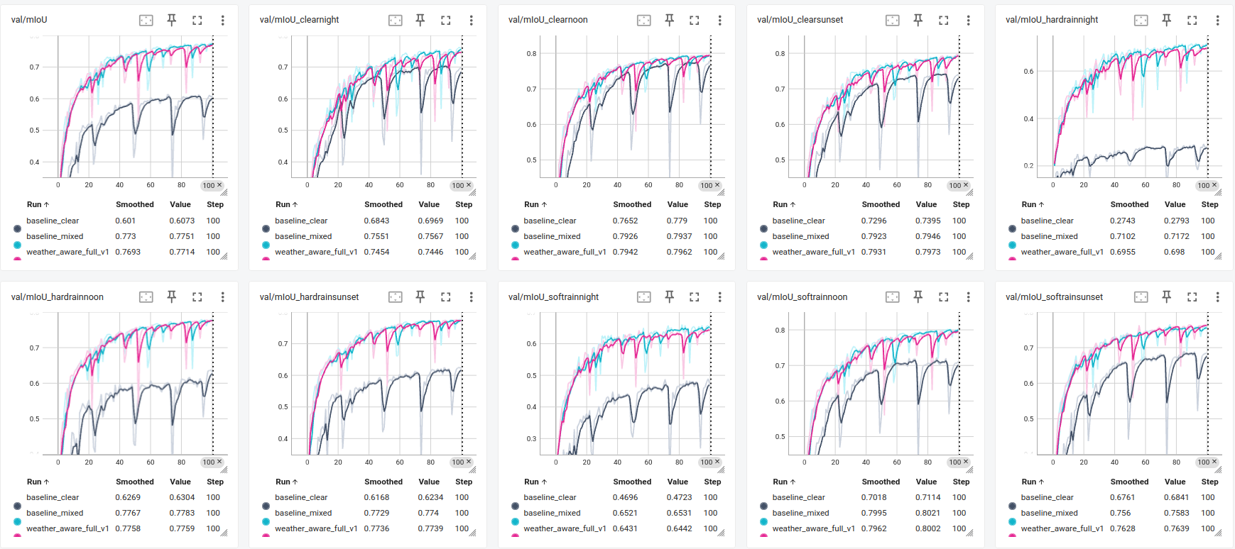 - Evaluated per-weather mIoU across all 9 conditions: curriculum training shows consistent robustness gains, especially on rare hard-rain nighttime scenarios where clear-only fails catastrophically
