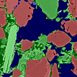 SEM images of bronze mold specimens, after processing through the SAM → VGG pipeline. Colors represent classified material: red = gravel (沙砾), green = clay minerals (黏土), blue = cavities (空腔).